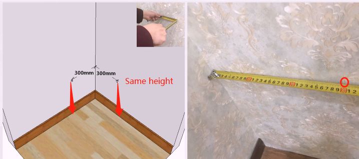 Step 2, Mark RIGHT side 300mm from the corner at the same height with left side.