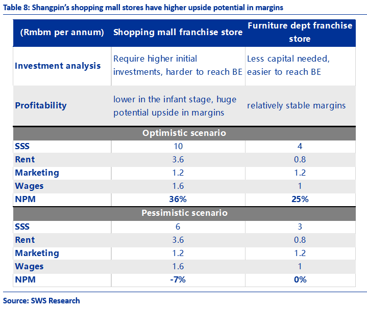 2) Net margin: substantial upside room. Shangpin’s blended net margin is c.8pptslower than peers’ due to high costs of the self-operated model, including rental(accounting for 3% of revenue), employee remuneration (14%), shopping mall advertising expenses, and decoration expenses. Given a large number of designers employed by each self-operated store (dozens to hundreds of designersper store) and considerable store rental costs due to large floor areas, the company's net margin of the self-operated mode is 3-4ppts lower than that of the franchise mode. Meanwhile, the company's advertising expense-to-revenue ratioexceeds that of peers by c.2-3ppts. In the future, with rising revenue exposure to the franchise business, we expect the company’s selling expense-to-revenue ratio to decrease, driving up net margin. From a sensitivity analysis, we find that Shangpin’s shopping mall stores with higher revenue ceiling generate much higher net profit margins than furniture department stores. However, in apessimistic scenario, shopping mall stores have more fixed expenses which will significantly drag down the profitability of distributors.