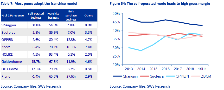 We select three whole-house customized furniture companies for financial comparison (Suofeiya, OPPEIN and Zbom HomeCollection (603801:CH – N-R)). Despite similar products, we note differences in the following indicators due to different sales models (Shangpin depends more onself-operated stores, while the other companies rely on the franchise model).1) Gross margin.Customized furniture companies generally book a gross margin of over 50-60% for the self-operated business (vs Shangpin’s 60%), 30-40% for the franchise business(vs Shangpin’s 30%), and c.20% for the TOB construction business. Different revenue exposure results in a significantly higher gross margin for Shangpin (7-8pptshigher than its peers). Based on peers’ revenue structure (excluding TOBconstruction and other businesses), we estimate Shangpin’s gross margin at c.32-35%, 1-2ppts lower than peers’,suggesting further room for improvement. Currently, we note intensified competition in the customized furniture industry, and local franchisees have launchedpromotional activities or given gifts to bolster sales. However, in the short-term,we note a limited impact from the price war at retail stores on manufacturers, withthe industry’s overall gross margin dropping c.0.5ppts. We expect customized furniture manufacturers to offer rebates and discounts to franchisees in the future. Coupled with a rising proportion of the franchise business and the expanding whole-house interior fitouts business, we expect Shangpin’s blended gross margin to decrease, reaching c.42.6% in 19E, 41.7% in20E and 41.6% in 21E.