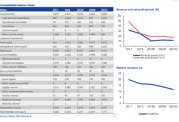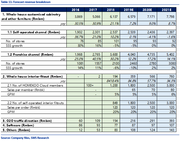 Profitability.The increasing proportion of franchise stores is likely to push up net margin, whilethe whole-house interior fitout business is still in the infant stage and thus will likely drag down the company's overall profitability. We expect bottom-line growth to outpace top-line growth with the slowdown of SG&Aexpenses. We forecast net profit of Rmb569m in 19E (+19% YoY), Rmb681m in 20E(+20% YoY) and Rmb801m in 21E (+18% YoY).