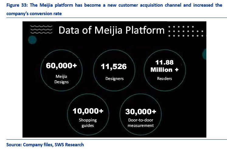 Flexible marketing efforts to increase customer conversion rate. The company uses big data analysis to send relevant articles and solutions based on online and offline customers’preference and needs. Therefore, its offline and online shopping guides not only need to attract customers, but also continue to clinch a deal. The company has connected its shopping guides nationwide to the Meijia platform, where it shares excellent marketing models and design plans. It has also established ashopping guide development system based on a grade and point mechanism. Weexpect its incentive measures to improve the ability and morale of its shopping guides. The Meijia platform’s efforts to attract customers with good designs have significantly improved the conversion rate of offline stores, highlighting the value of the company’s design services. It also shows the company’s different retail strategies from traditional furniture manufacturers.