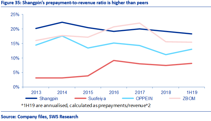 3)Prepayments from customers. Under the self-operated mode, the company recorded huge prepayments (Rmb1.16bn as ofend-9M19), with a significantly higher prepayment-to-revenue ratio than its peers. On the other hand, as the company expands the whole-house interior fitout business (it started the business in 2H17), customers will make full payments inadvance, while HOMEKOO Cloud members will pay deposits. As such, we expect the company’s prepayments from customers to continue to increase in the future,resulting in a higher equity multiplier.