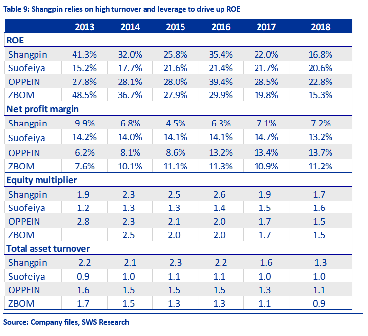 Turnoverrate: Shangpin records a high total asset turnover due to the following reasons. Largeexposure to the self-operated business results in higher revenue than peers(revenue recognition under the model is nearly twice that of franchising).Meanwhile, about half of the company’s stores are shopping mall stores, enjoying significantly stronger sales per store than peers (around twice the sales of peersin terms of franchise stores). In addition, accessory home furniture sales boast higher sales per order and per store compared to peers, thanks to itsfirst-mover advantage and an asset-light model based on OEM and consignment sales.