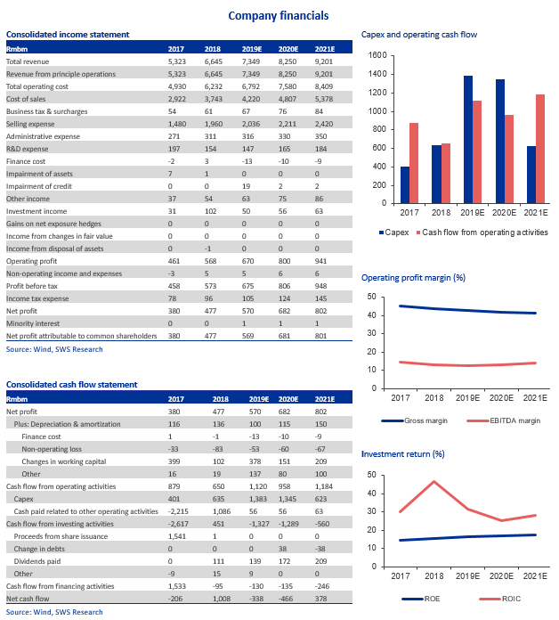 Rapid top-line and bottom-line growth. Benefiting from macroeconomic growthand consumption upgrades, the whole-home customized furniture industry has undergone rapid expansion in the past few years. In the meantime, Shangpin branched out hundreds of new stores, operating a total of 2,362 stores (including 2,269 franchised stores and 94 self-operated stores) as of end-1H19. The company reported 18A revenue of Rmb6.65bn (+24.8% YoY, representing a 5-year Cagr of 41.4%), and net profit of Rmb477.08m (+25.5% YoY, with a 5-year Cagr of 32.5%), significantly outpacing its peers. Despite the downturn of the property market, Shangpin maintained strong momentum in 9M19, generating revenue of Rmb5.06bn (+9.0% YoY), net profit of Rmb335.17m (+14.5% YoY) and a net profit before extraordinary items of Rmb285.02m (+50.6% YoY).