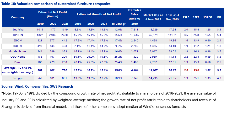 We see Shangpin’s retail- and IT-based mindset makes it different from peers. It is actively innovating in channels and business models. Once thewhole house interior fitout business develops smoothly in future, we expectit to bring additional growth driver for the company. We are also positive onits unique competitive advantages interms of IT and designing capability. Design is the key to customer conversion. Shangpin has established a strong advantage in design which isdifficult for peers to surpass in the short term. In addition, as the firmshifts to the franchise model, coupled with narrowing operating expense-to-revenue ratio and the potential breakeven of whole-house interior fitoutbusiness, we see further upside in profitability.The company is trading at 25x 19E PE, 4.3x 19E PB, and 1.3x 19E PEG, higher than the industry-average level, which we see as reasonable given its business model. However, its 19E price-to-sales (PS) ratio is only 1.9x, significantly lower than peers. We believe that the company's profitability is stillon an upswing, with a larger upside for net margin. As such, we considerPS ratio as a better valuation method for Shangpin. We derive our target price of Rmb92.47 based on 2.5x 19E PS. With 28.5% upside, considering the potential downward effect of mismanagement of franchise channel, we initiate coverage of the stock
