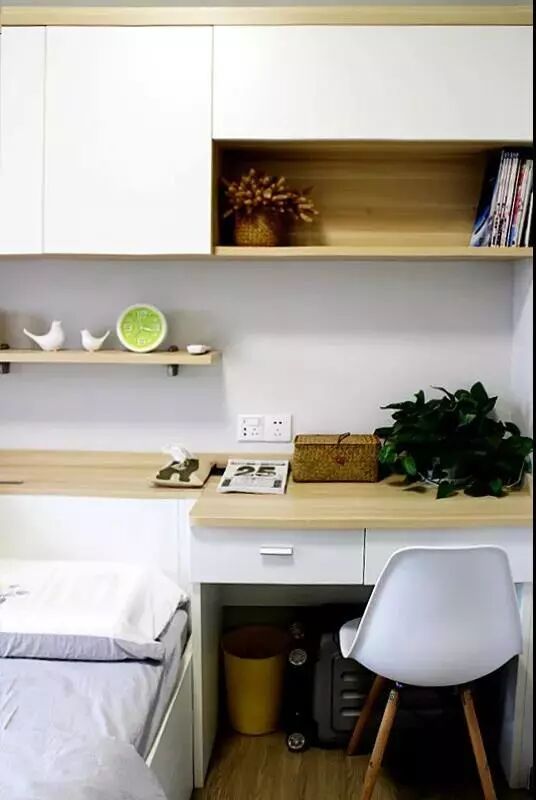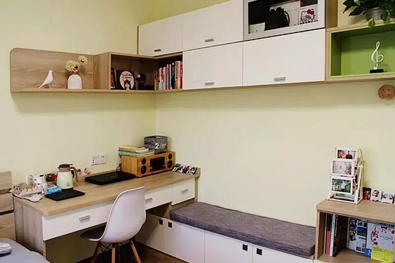 There is a desk beside the head board of bed and we can read and work here. Next to the desk is a row of base cabinet, playing a role of both storage and seats. With the cushion on, this is the corner I love most because I can seat on it, reading books or listening to music comfortably.