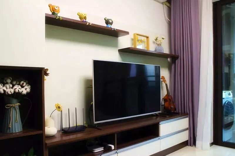 The living room is in simple style with the TV cabinet and the sideboard connected. And most of the decorations on the sofa and partition cabinet are DIY.