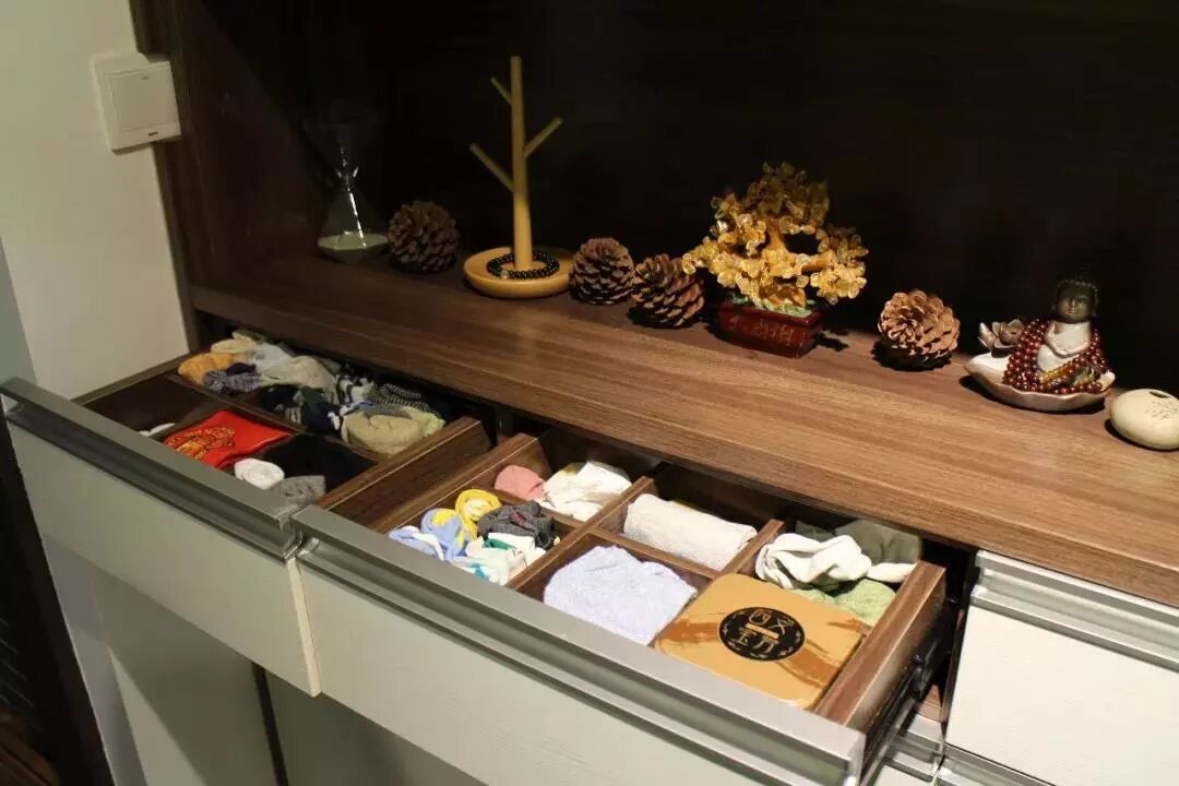 The drawers below the shelf were designed into different storage racks, such as square rack for briefs and long rectangle rack for bras which is not convenient to show here.