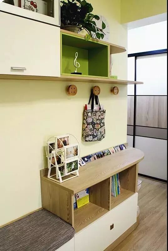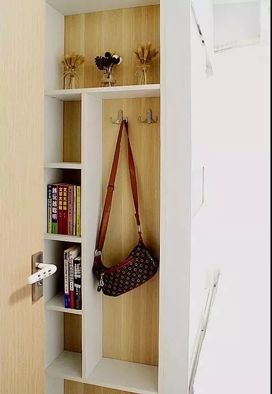 If you keep walking in, you will see a small entrance. There is a full wall cabinet on the left side, enlarging the storage space. As for the wall unit, there is a hanger on the left-up side. It is very convenient for us to hang bags, umbrellas and other things. The rest part of the cabinet is made of shelves, which can be used to keep the tissue, baby's diaper, and daily necessities.