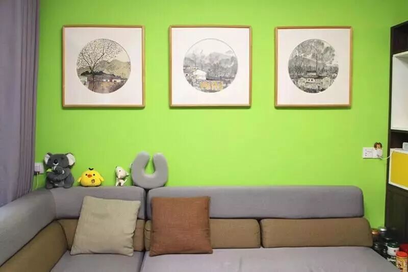The background wall behind the sofa is green, with 3 hanging pictures. And I have to say that the L-shape sofa is really comfortable!