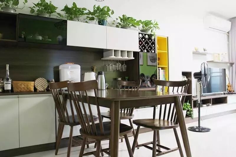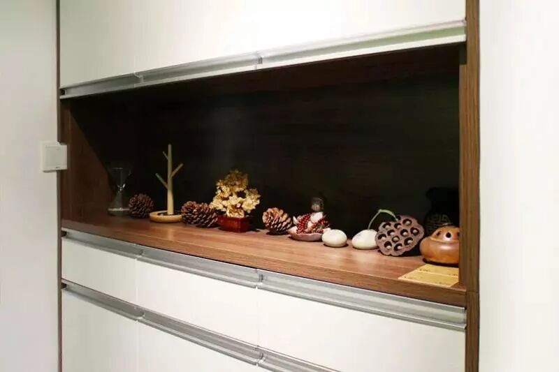 My apartment is a typical horizontal room, with the dining room and living room connected. At the beginning, I would like to make the open cabinet as many as possible. But according to the designer, it’s better to make half-open cabinets. And then, the open part of the cabinets can be used to display those good-looking objects and collections. And the rest part can be used to store other items. After moving in half of a year, I feel strongly that, fortunately, we listened to the advice from of the professional designer! It is so great!