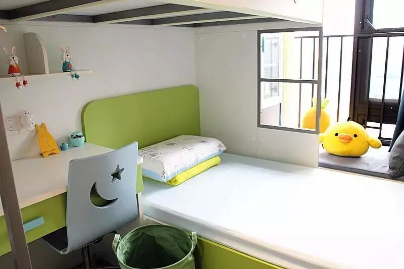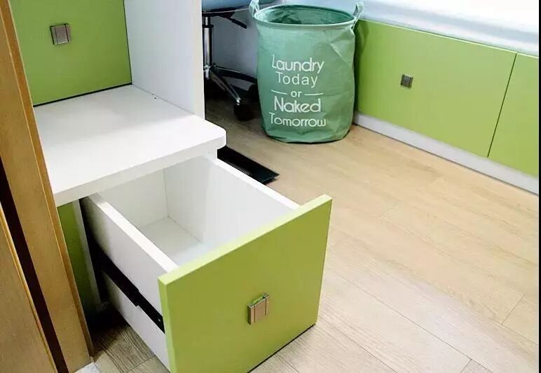 The drawer-stair to the upper bed, the space under the lower bed and even the cabinet in the bay window are storage space, which is large enough.