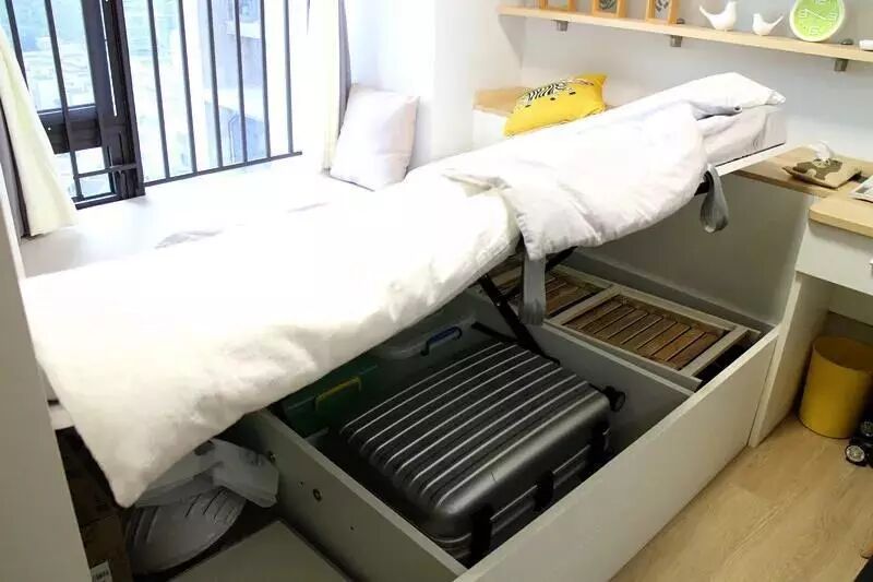 What surprised me most is that the head of the bed is designed into an up-open storage cabinet! We can put the sundries in. Basically, the cubes you can see in this room are all capable of storage.