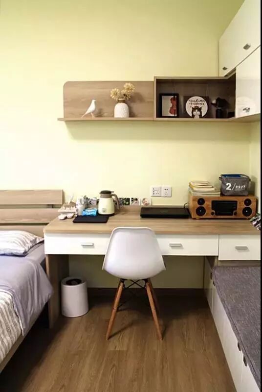 The guest bedroom is so small that there will be little space for the passage with a 1500mm bed. Considering that two people need to sleep on the bed, finally the designer decided to make a bed of 1350mm. Moreover, the bay window was designed into part of the bed, which was comfortable for two people to sleep on, leaving enough space to make a desk. Designer explained the whole idea of the design to us later. Actually, we didn’t want to make a desk at the beginning. But professional and considerate as the designer is, she always gives some helpful suggestions from our perspective of future living life.
